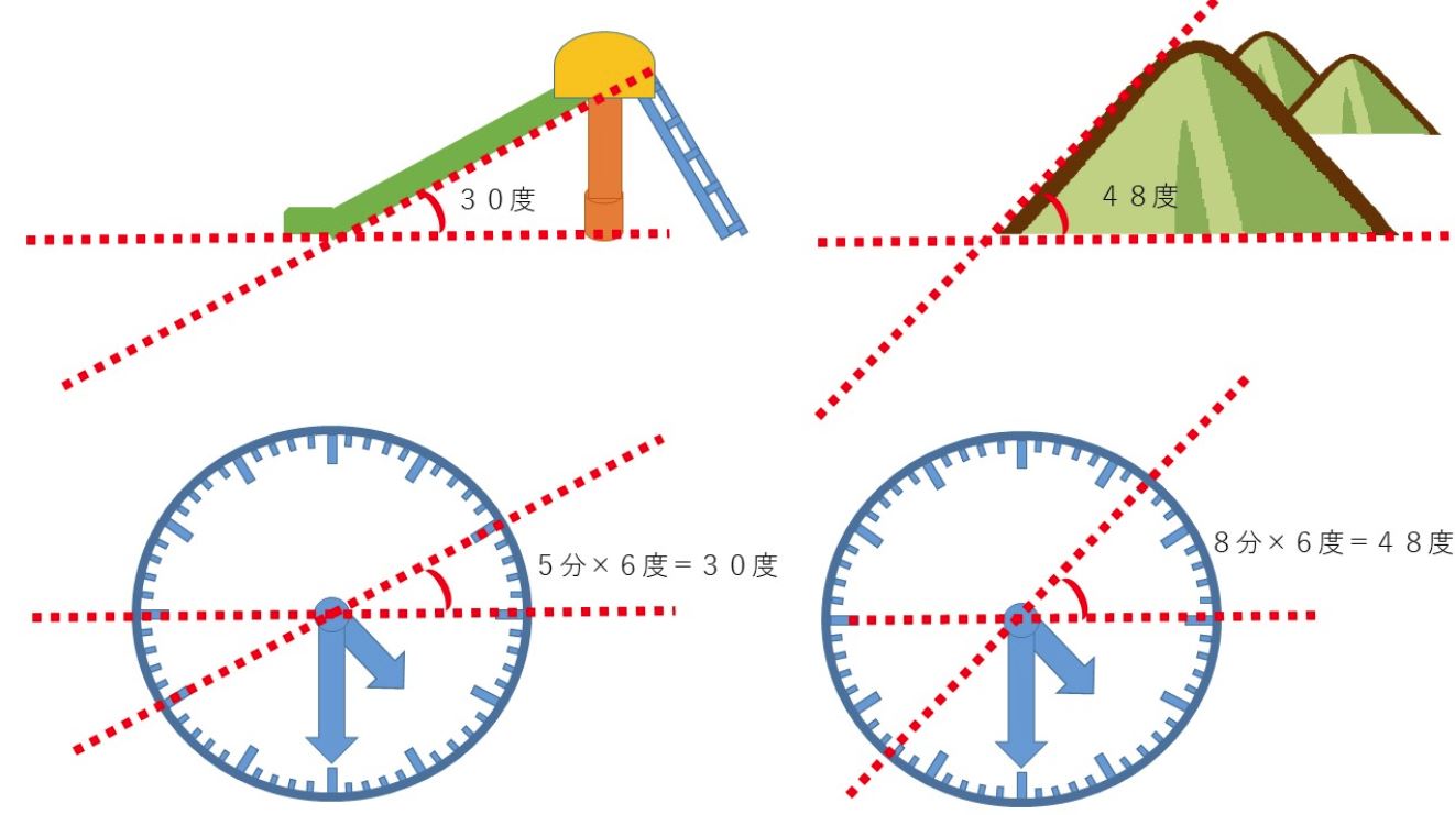 #アナログ時計 が #分度器 の代わりになるのをご存じですか?1時間で360度ということは、毎分6度進むことになります。文字盤の中心点を物や地形の傾斜に合わせ、時分のメモリ数×6度を計算するとおおむねの角度がわかります。登山等では急な山道等の角度を確認して無理をしないようにお願いします。 pic.twitter.com/BZHb1QyuhG